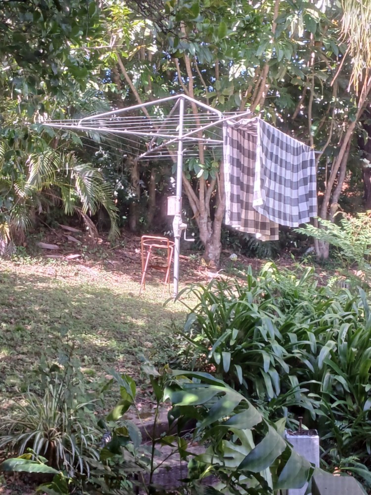 Morning sunlight shines on the ubiquitous Australian Hills Hoist rotary clothes line. A device for drying clothes and swinging on, around and around, until your arms ache or your mother shouts at you to stop. Happy New Year 2026 © image Gretchen Bernet-Ward 2026