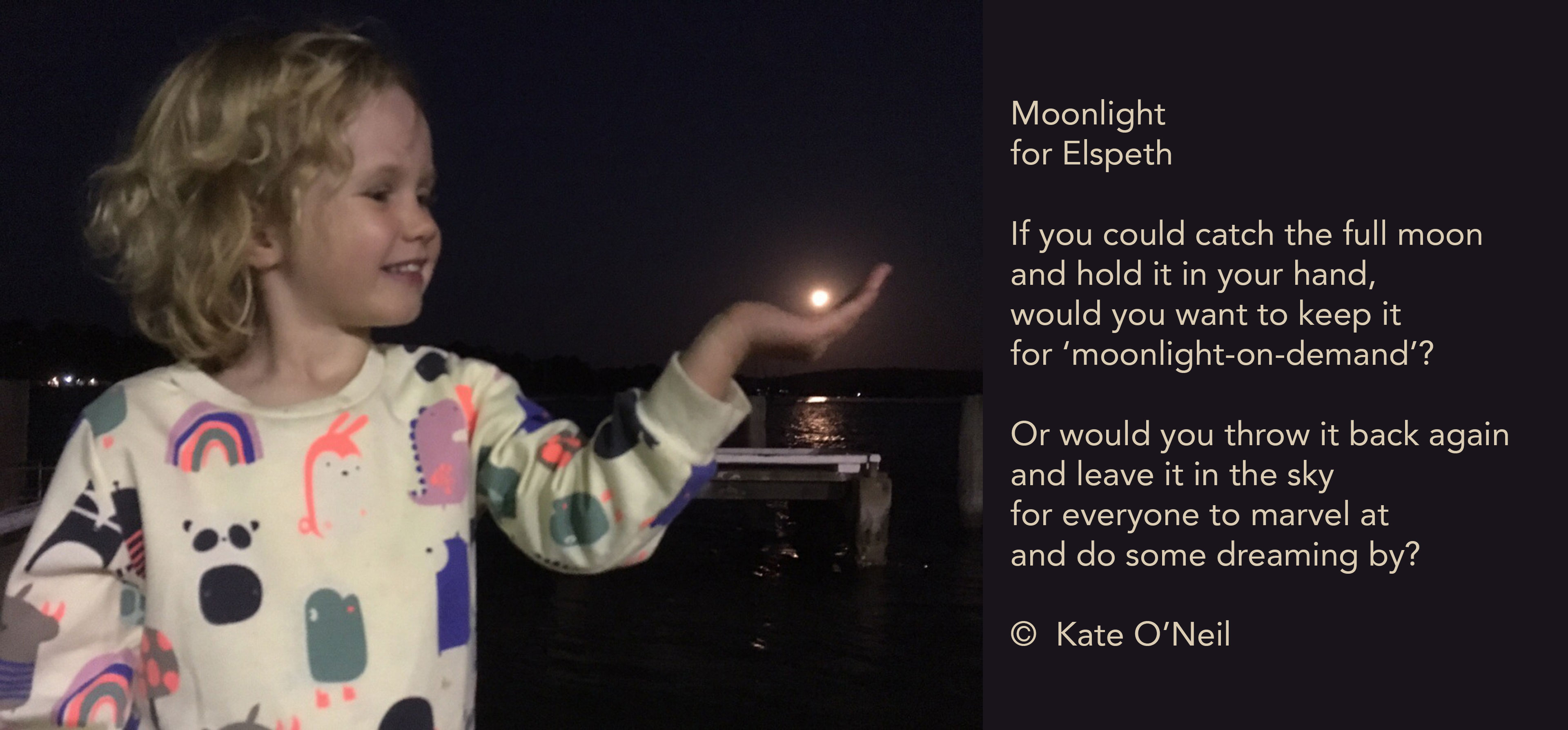 You are asking this of someone whose word files are loaded with favourites! If they are in the cloud, it will rain my favourite poems one day. What if I narrow this to ‘favourite poem for children’? Or better still, ‘favourite concrete / shape poem for children’? I can do that. It’s ‘The Moon Speaks!’ by James Carter. It’s on his website: