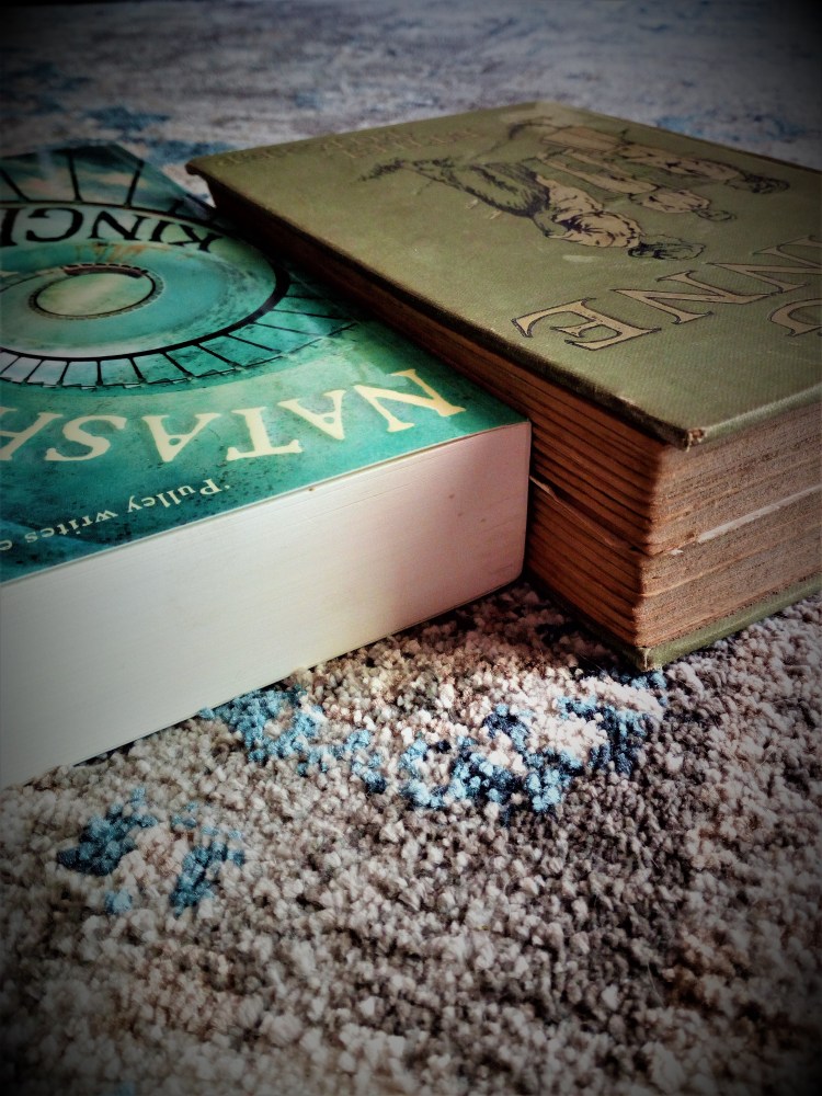 The difference between the size and weight of these two books was misleading until held in my hands. Natasha Pulley’s The Kingdoms is a slimmer volume with a lighter bookcover and thinner pages compared to Ethel Turner’s bulky King Anne with its fabric-over-cardboard bookcover, cotton stitching and stiff parchment-like pages. The modern publication is 200g heavier.