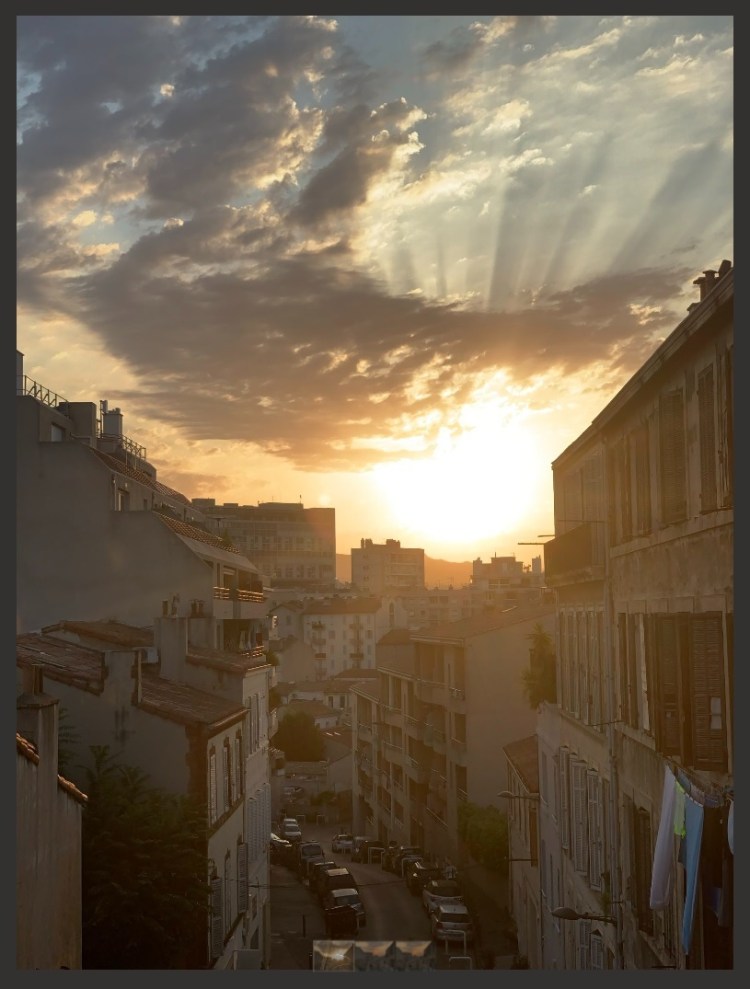 As I sit on our small balcony with the French doors open behind me, I can see a front view over the trees, over the shallow valley and up the opposite hillside. Roof tops gleam here and there and a council bus grinds its way up the steep incline of a street still named ‘lane” from way back when it took farm traffic up and over the hill.