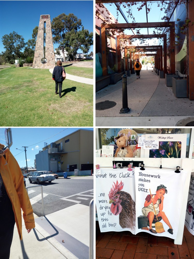 This must be the biggest stone thermometer in Australia. A detour between buildings lead to a sculpture with an ibis taking flight (used in my ‘Exercise Makes You More Attractive’ post). During lunch I read the local newspaper Stanthorpe Today and discovered the old white 1960s Valiant sedan I had photographed cruising the streets was taking part in a Classic Car Rally. Just love those teatowels!