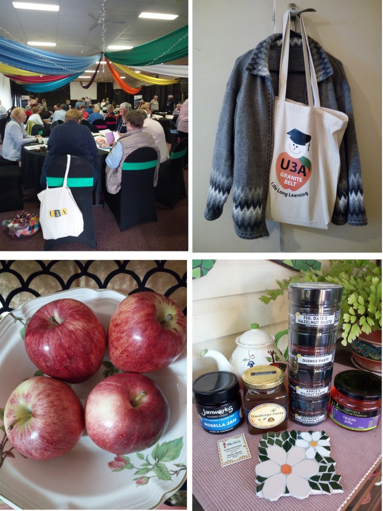 A packed 2-day Program of informative U3A events with eloquent guest speakers, living up to the title of ‘Coolest’ Conference. A highlight for me was Copyright with Irene Sachs, a straight-forward look at Australian copyright laws. Everyone got a goodies bag and the Daisy mosaic tile was hand-made specially, a different one in each bag. There’s my grey Alpaca cardigan from Pure Inca. Fresh-picked fruit abounded, Stanthorpe apples were prominent—I love them! Local food take-home’s included Jamworks Rosella Jam, Sutton’s Apple Jelly, Stanthorpe Honey, Jersey Girls cheese, minus bakery delights consumed on route.