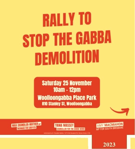 You are invited to join the “Rally to Stop the Gabba Demolition” outside the stadium in Woolloongabba Place Park, 810 Stanley Street, Woolloongabba QLD 4102, from 10am on Saturday 25 November, 2023.